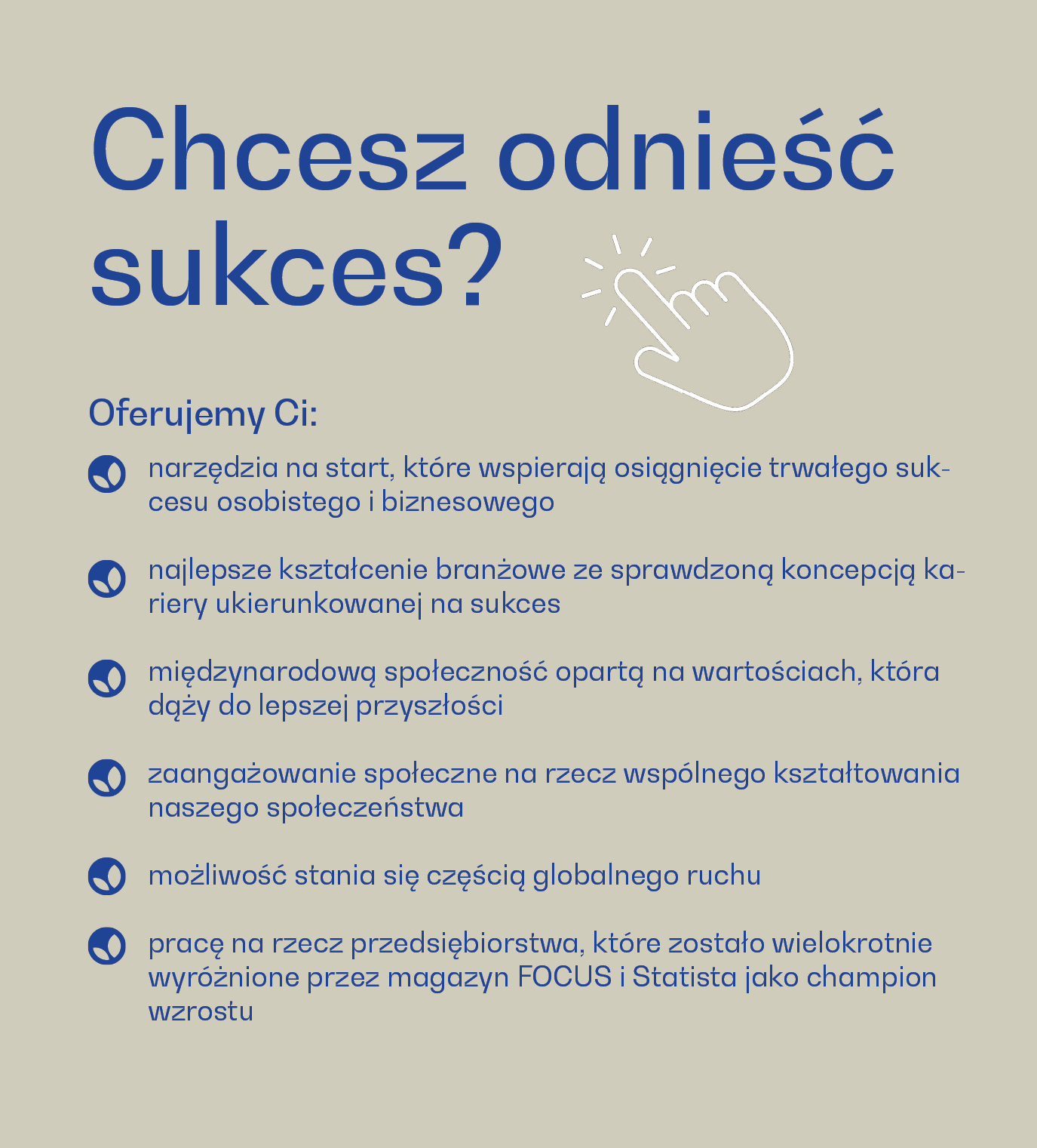 Sukces w hajoona nie jest przypadkowy. Sukces można zaplanować. W tym celu udostępniamy Ci mnóstwo narzędzi, instrukcji, szkoleń, spotkań i wiele innych działań, które od lat testujemy w naszej działalności. Z doświadczenia wiemy, że są one bardzo przydatne w praktyce. Pomogły już tysiącom partnerów hajoona w rozwoju ich własnego biznesu w ustrukturyzowany, zrównoważony i skuteczny sposób. Twój mentor będzie towarzyszyć Ci w Twojej drodze i krok po kroku przeprowadzi Cię przez naszą koncepcję sukcesu.